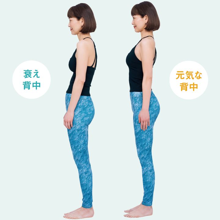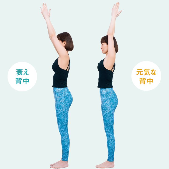 まっすぐ立った状態で横から見たとき背中が丸く肩が内側に入っていたら背中が衰えている証拠。背中ケアに取り組んで。