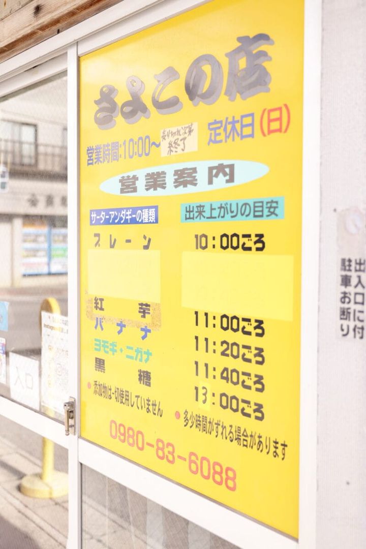 サクサク軽い食感がクセになる店主の東恩納さよ子さんが揚げるサーターアンダギー。行列が絶えず多い時には1日1000個売れることも。看板に“プレーンは10時頃”“紅いもは11時頃”と揚がる時間の案内があるので揚げたてを狙いたい!