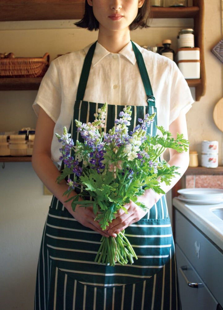 『ル・ベスベ』の松岡龍守さんが選んでくれた今月の花は、ルピナスのパールブルーとパールピンク。ハーブの一種であるゼラニウムの葉とともにブーケに仕立てた。「線が細くて柔らかいルピナスは、自然と茎に動きが出るのが特徴。穂のように細かくつく花も相まって、ナチュラルな雰囲気を醸します。飾るうちに頭の向きが変わったり、花がほんのりと色づいたり、繊細に様子が変わるのを慈しみたいですね。近頃は店頭に並ぶ葉ものの品種も増えていますが、今回のようにハーブを少し加えれば、夏の近づくキッチンに爽やかな香りを運んでくれますよ」(ル・ベスべ 03−5469−5438) シャツ¥29,700(A.P.C./アー・ペー・セー カスタマーサービス 0120−500−990) エプロン¥7,480(ラッシュブルックス/マークスインターナショナル 03−6861−4511) その他スタイリスト私物