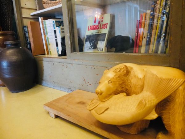 珍しい白色の木彫りの熊。奥の棚にも黒い熊が二匹隠れています