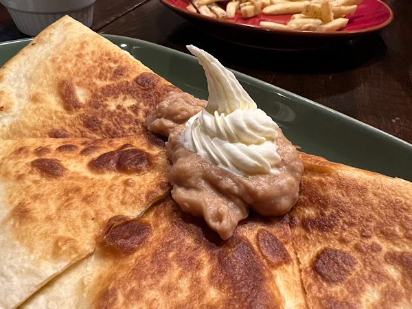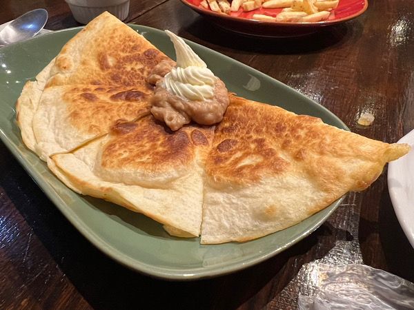 ケサディーヤのプレーンLサイズ(1100円) トルティーヤをサワークリームでいただくピザのようなものです。プレーンを選びましたがサワークリームとフワフワの生地がおいしいです。