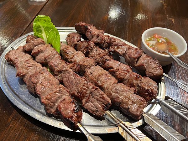 シュハスキーニョ1本(1023円) ブラジルの名物料理です。ブラジルでは主に屋台で食べられるようですがボリュームがあります。シュラスコのミニというような意味です。こちらのお肉は牛イチボ肉です。