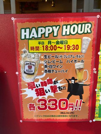 平日はハッピーアワーがあります。しかも開店時間の18:00から19:30まで!長い!飲み放題の時間くらいあります!この時間内はドリンクが363円!そりゃー頼みますよ〜。