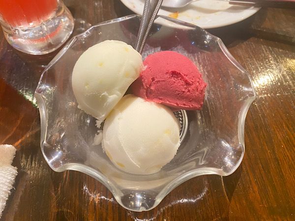 最後に本日のアイス(440円)を頼んだらバグったかのようなアイスが出て来ました。3種類!びっくりしました。ピリ辛になった口にさっぱりシャーベットが最高でした。