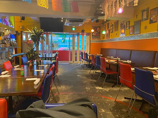 店内には骸骨をかたどった切り絵がぶら下がっていて楽しいムードが満点。 席は少人数から大人数まで可能。この日はほとんどが5人以上のグループで、遅い時間から20人くらいの団体グループも来ていました。