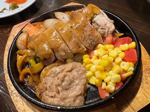 チキンファヒータ(1430円) ファヒータとはトルティーヤで包んで食べるグリルした肉料理です。メキシコ風のアメリカ料理だそうです。肉はハラミが主流だそうですがこちらではチキンでの提供です。 メインの肉と玉ねぎやパプリカなどの野菜、サワークリームやサルサなどをトルティーヤで包んで食べます。
