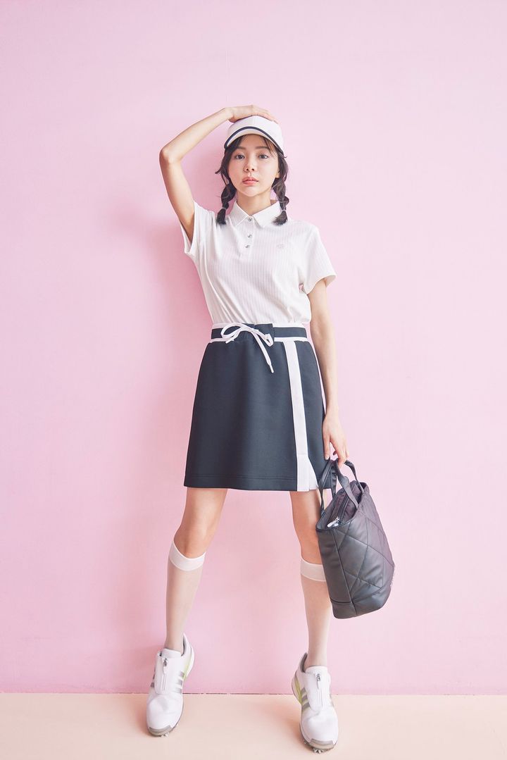 [シャツを着回し]キャップ¥4,950/ニューバランス ゴルフ スカート¥6,999/ティゴラ シューズ¥28,600/アディダス ポーチ¥9,900/テーラーメイド