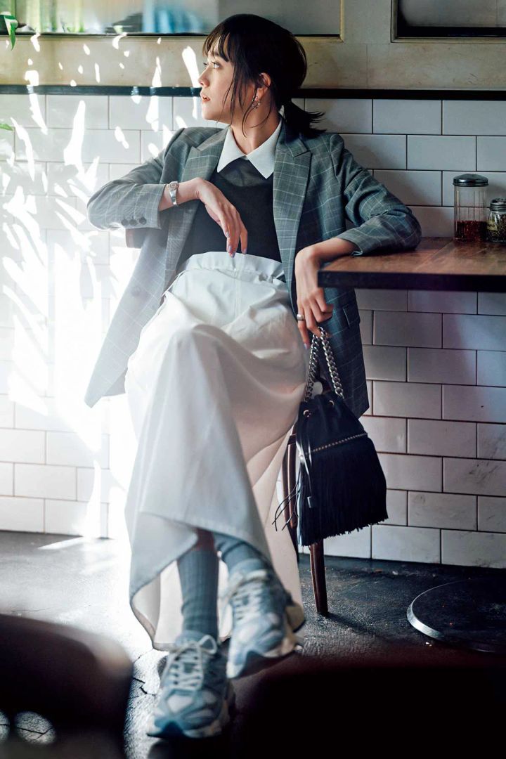 トレンドだからこそ被りがちなシアートップスは、襟つきのタイプを選べば一歩上級者の着こなしに。ジャケットとシャカシャカ素材のナイロンスカートが、トップスの甘さを中和してくれます。足元はソックス×スニーカーでマニッシュに仕上げて。