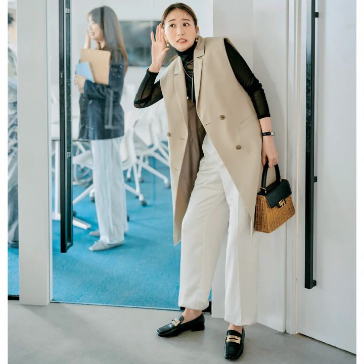 万能なシアートップスは、1枚で着るのも良いけれど断然今年らしいのはレイヤードスタイル! タイトなトップスにさらりとジレを羽織れば、体型カバーにも役立ちます。小物はブラックでまとめて、統一感を意識して。