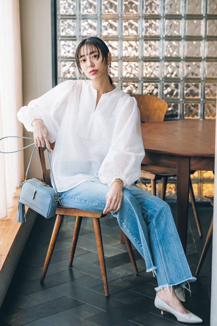 ボリューミィなバルーンスリーブブラウスは、春コーデの主役にぴったり。ほんのり透け感のあるシアー素材で、コーデに軽やかさをもたらしてくれます。デニムとバッグの色をさりげなく合わせたテクニックにも注目を。