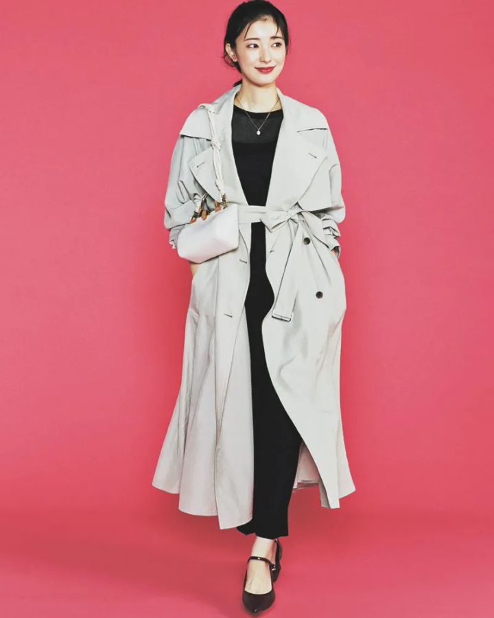 重たく見えがちなブラックコーデも、シアートップスをチョイスすることで軽やかに。揺れ感のあるトレンチコートをバサッと羽織れば、シンプルなのにどこか女性らしさの漂う大人コーデが完成します。仕上げに、白のショルダーバッグで春らしさを散りばめて。