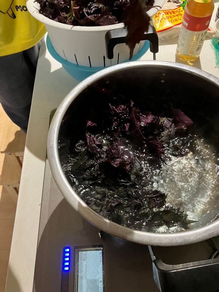 3)沸騰したお鍋で赤じその葉を2-3分茹でる。