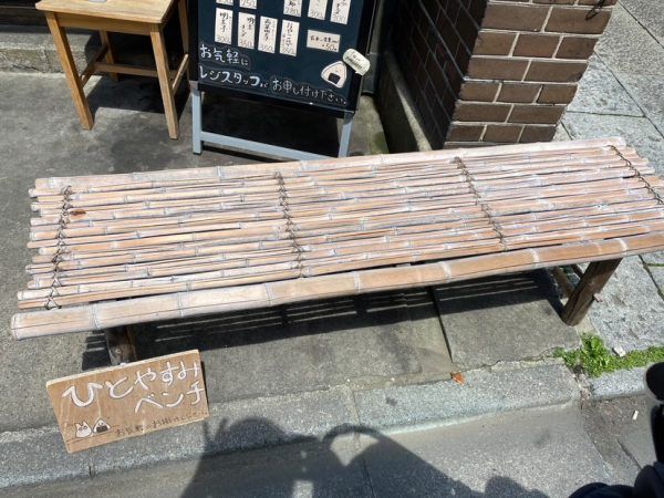テイクアウトコーナー出た横には、ひとやすみベンチがあります。ベンチに座って見る商店街の眺めも最高なのでぜひ来店した際は、ひとやすみベンチにも座ってみて下さい!!