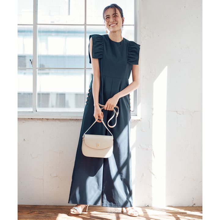 上品ネイビーのオールインワンは メリハリシルエットできれい見え。 パール&フリルで大人仕様に