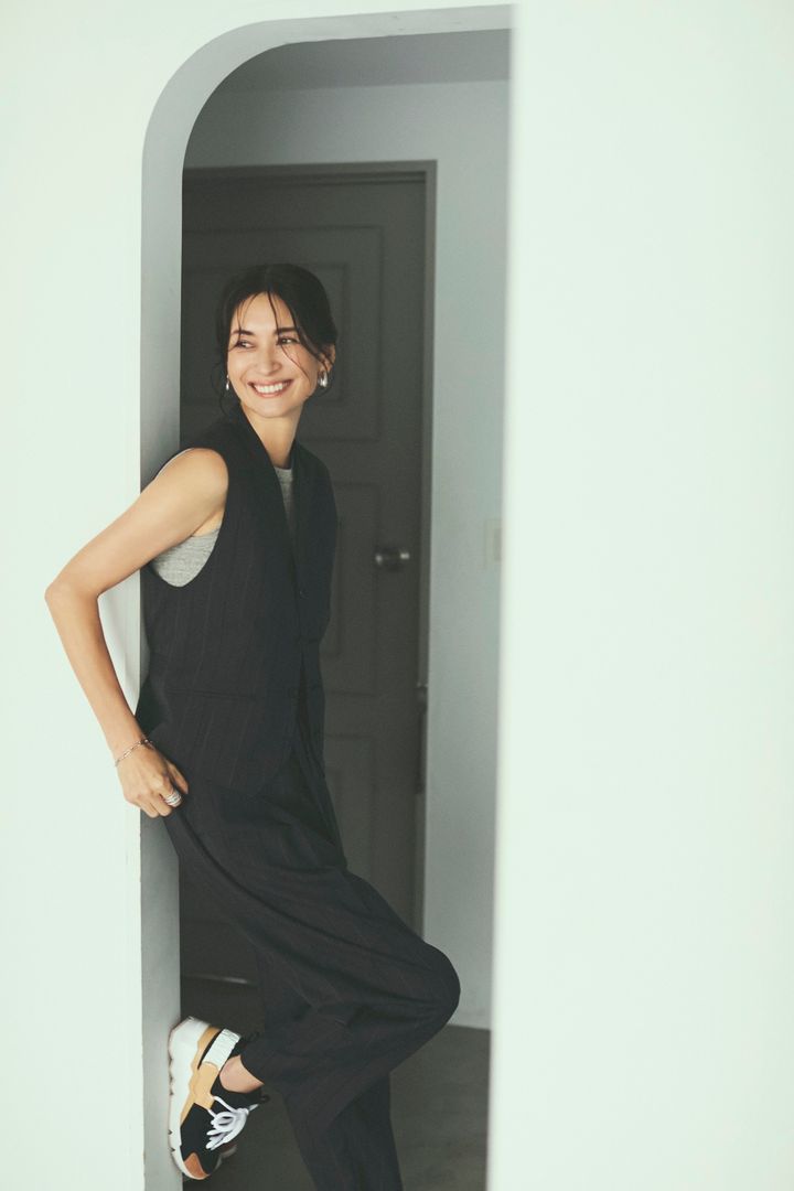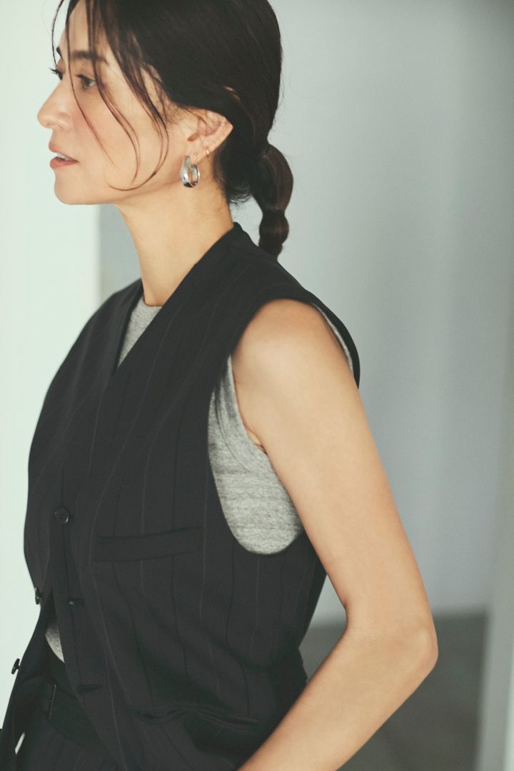 ベスト¥52,800パンツ¥50,600(ともにカオス/カオス 丸の内)タンクトップ¥7,150(ザ シンゾーン/シンゾーン 表参道本店)スニーカー¥111,000(ピエール アルディ/ピエール アルディ 東京)ピアス¥53,600ブレスレット¥32,700リング[右手]¥159,500(すべてトムウッド/トムウッド 青山店)