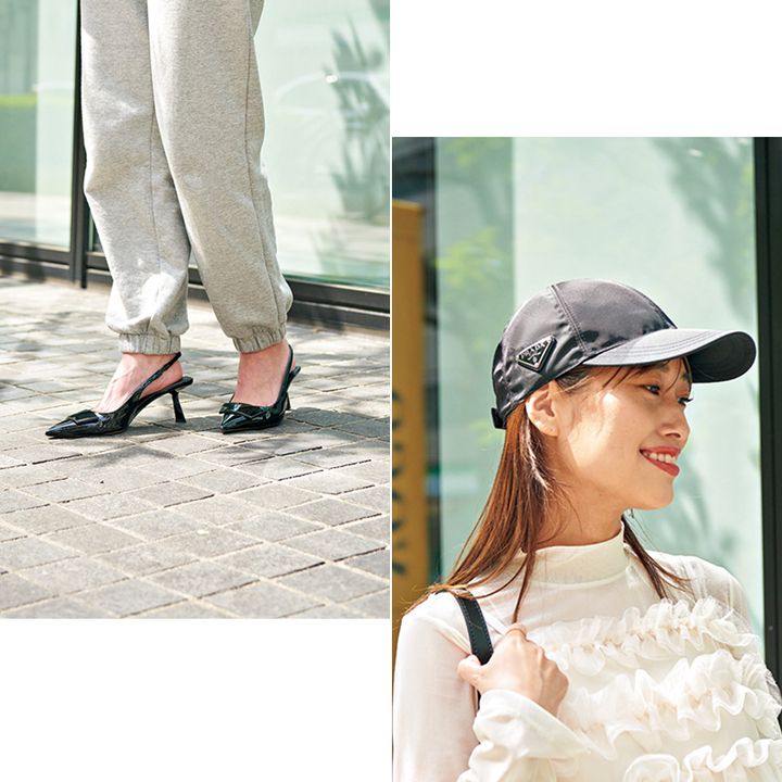 辛口のパテント素材でポインテッドトゥのZARAのパンプスとナイロン素材のプラダのキャップを合わせて、全体を締めました。