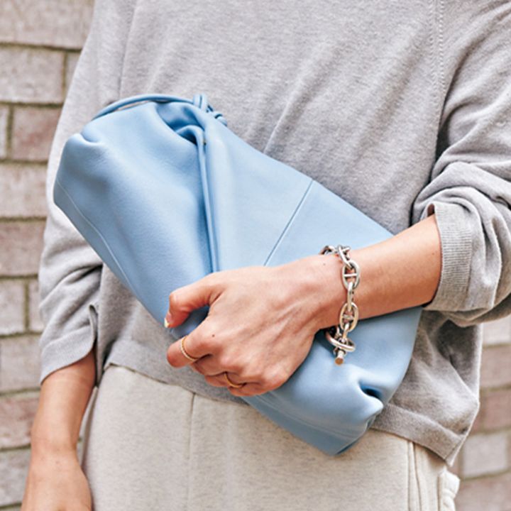 オールグレー合わせはすっきり見せたくて、ボッテガ・ヴェネタのきれい色バッグを差し色に。スウェットだからこそ、フェミニンさが必要です。