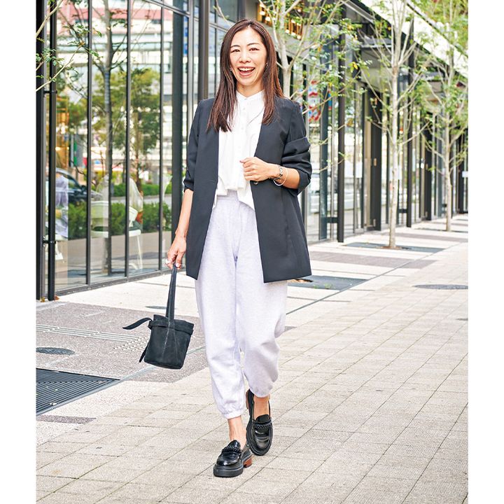 カジュアルすぎるアイテムが苦手で例外ではなかったスウェットパンツ。今年になってきれいめコーディネートのお手本がまわりに増えて、私も思い切って挑戦してみたくなりました。ママ友とランチにはきれいめなジャケット×Nalaのブラウスで全体にメリハリをつけます。