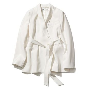 白共布ウエストベルトつきジャケット/ZARA(ザラ カスタマーサービス) ウエストベルトは高めの位置にデザイン。ボタンレスのショールカラーでエフォートレスに。