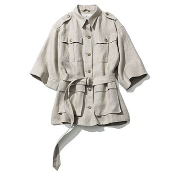 ベージュ共布ウエストベルトつきジャケット/レリタージュ マルティニーク(マルティニーク ルミネ横浜) シルエットはゆったりめ。涼しげなグレイッシュなカラーリングと、乾いたような質感が夏にぴったり。