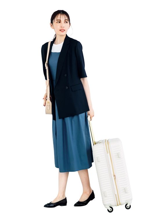 キャミ×ノースリセット(Tシャツ)¥20,900/Stola. ジャケット¥18,920/インディヴィ(ワールド) カップ付きキャミワンピース¥3,990/UNIQLO ショルダーバッグ¥64,900/ジャンニ キアリーニ(ジャンニ キアリーニ 銀座店) パンプス¥63,800/ネブローニ キャリーケース¥40,700/ジュエルナローズ(ジュエルナローズ新宿ミロード店)