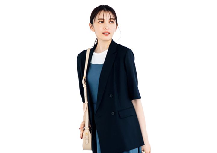 3. きちんと感が出る半袖ジャケットが活躍!ノースリ&キャミワンピとつくるきれいめ通勤コーデ【毎日コーデ】