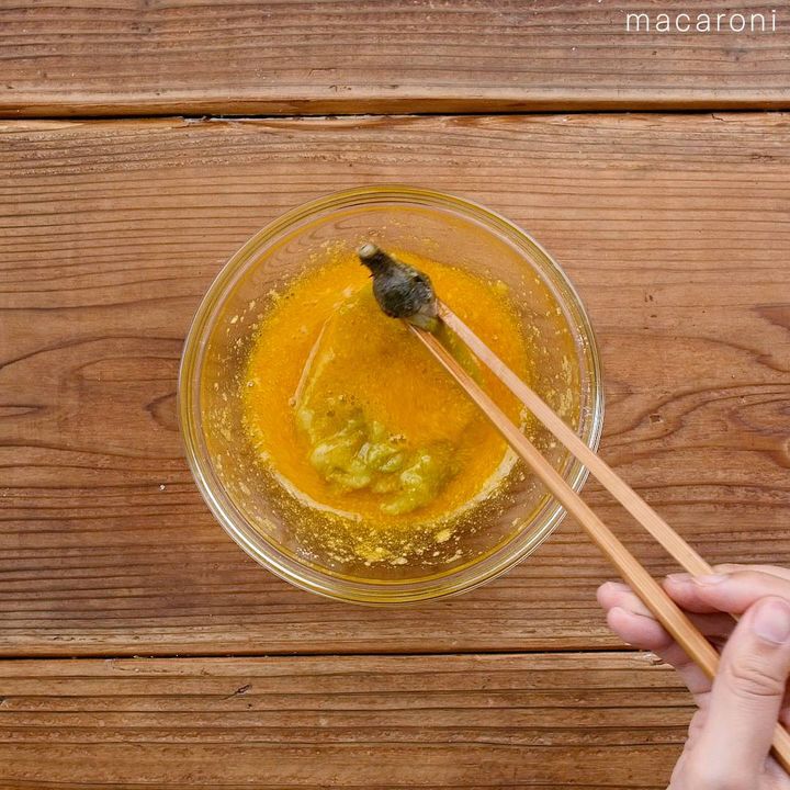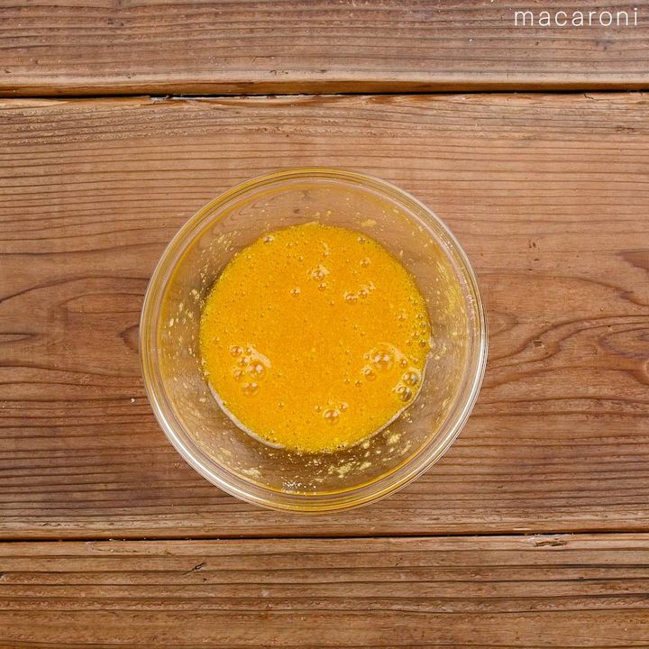 2: ボウルに卵、粉チーズ、塩こしょうを入れて溶きます。