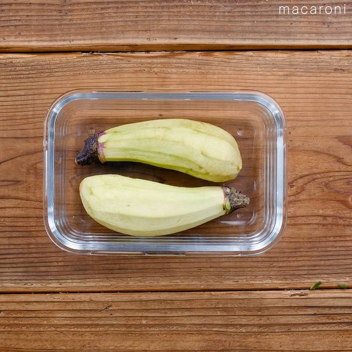 1: ヘタを残した状態でなすの皮を剥き、ふんわりラップをかけてレンジ600Wで3分加熱します。