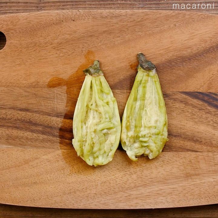 なすを開くときは、中央を割いてから左右にフォークを入れるときれいに開きますよ。