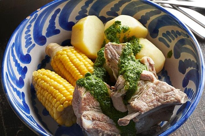 塩豚と辛いソースがたまらない"カナリア風豚スペアリブととうもろこし、じゃがいもの煮込みモホ・ベルデ添え"