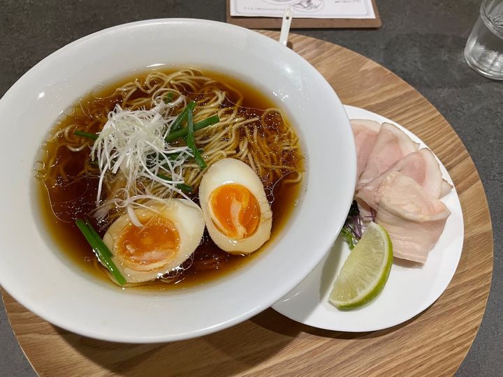 味玉のみトッピングしました。色が濃いスープですが、醤油の風味はそこまで強すぎず、飲んでみると丁寧に作られたであろうコンソメの風味がうわっと広がります。