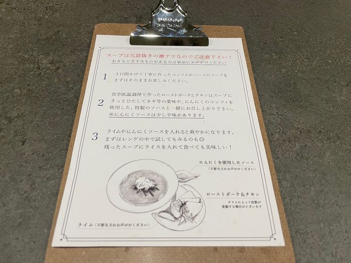 1人1枚、食べ方の紙が目の前に置かれています。 ローストポークとチキンは、そのまま食べることもできますが(もちろんそのまま食べても美味しい)、書かれている通りスープをくぐらせて薬味を添えると、1つの料理のよう。