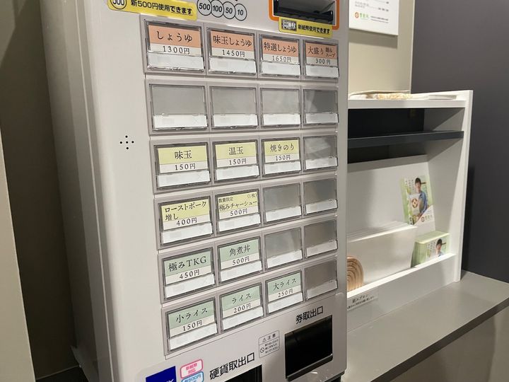券売機。味玉のほかに焼きのりもトッピングできます。また丼系や、麺の大盛りも注文できます。