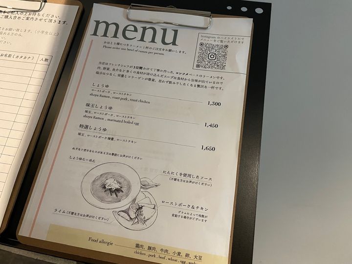 こちらがメニュー。コンソメベースのしょうゆ味ラーメン1種類のみ。それに味玉が乗っているか、さらにローストポークを増やすか、というだけの違いです。