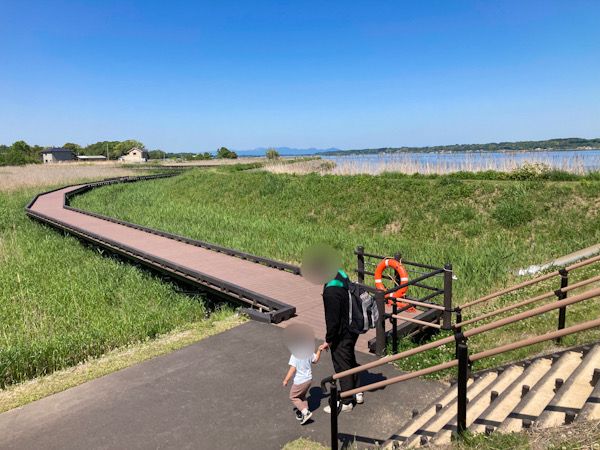 駐車場から遊具広場に向かう途中に、涸沼(ひぬま)が見えました。木道も整備されていて、奥では「メダカゾーン」や「ヒヌマイトトンボゾーン」で自然観察ができるそう。