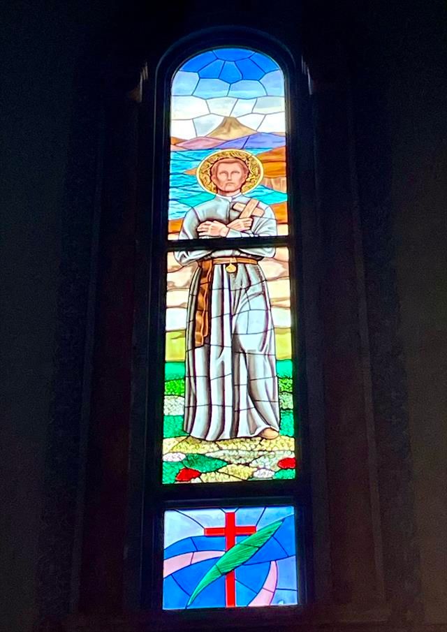 右手にあるのは、歴史の教科書でもおなじみ「聖フランシスコ・ザビエル」。彼が上陸した鹿児島にちなみ、背景には桜島が描かれています。