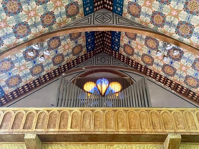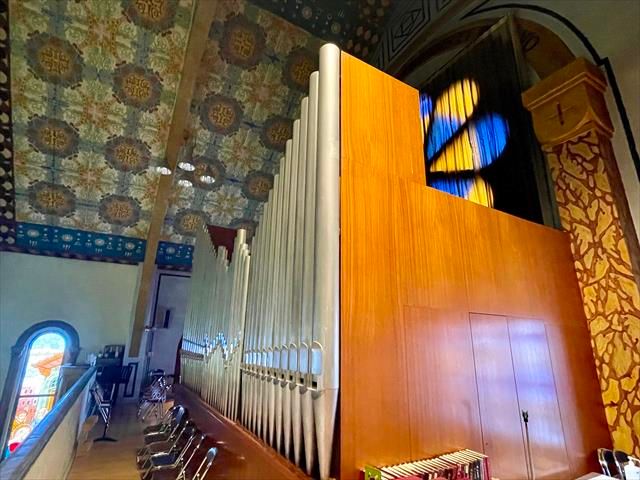 祭壇と反対側(正面玄関の側)には、パイプオルガンと、円形のステンドグラスが目を引く2階も。今回は特別にそちらまで登らせていただきました。