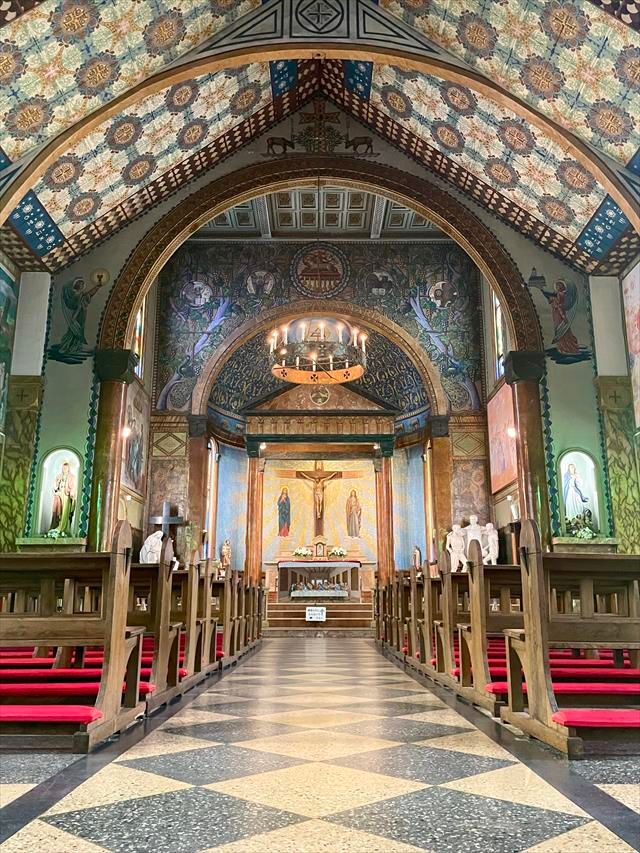 天井や祭壇の鮮やかな装飾、アーチのかかるロマネスク様式の建築美、光差し込むステンドグラス……
