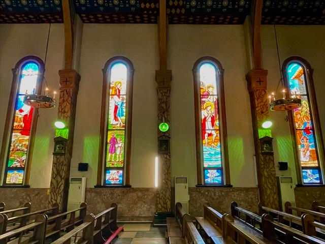 教会の両側の窓のステンドグラスは、聖堂の落成40周年を記念し、1992年に入れ替えられたもの。実は元々のステンドグラスは、格子模様の地味なものだったそうです。
