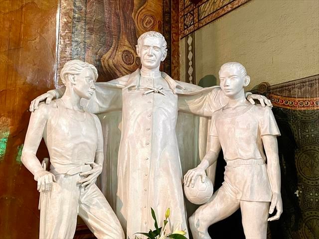 祭壇左側の「ピエタ」(=イエス・キリスト磔刑後の像)と対になるようにして右側に位置するのは、ドン・ボスコ司祭の彫像。カトリック碑文谷教会が委託され、その通称の由来ともなっている「サレジオ会」を設立された方です。