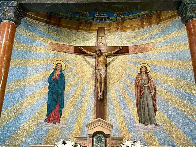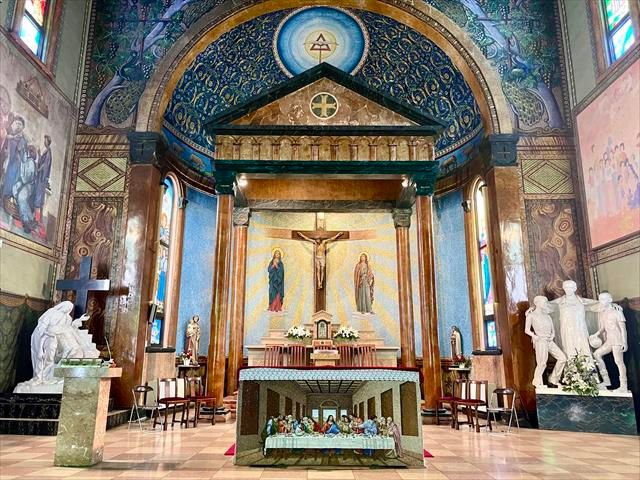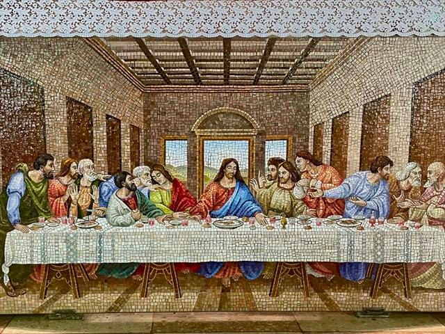 祭壇前面の「最後の晩餐」のモザイクタイルは、それぞれ1995年と1997年にイタリアの職人さんが手掛けたもの。