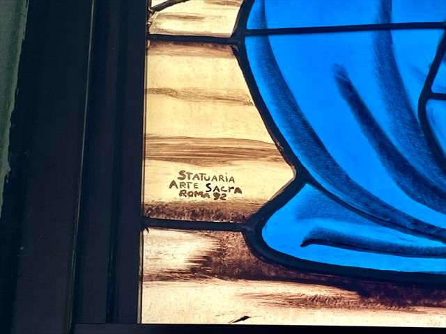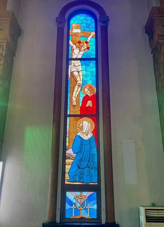 華やかに聖堂を照らすステンドグラスは、イタリア・ローマの工房で製造。細部まで作りこまれていることが分かります。