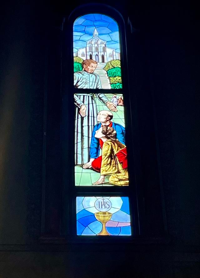聖堂を囲むように配置されるステンドグラスにはイエス・キリストの生涯の物語が表現されますが、先ほど紹介した祭壇の上方には、日本の教会ならではの絵柄も。