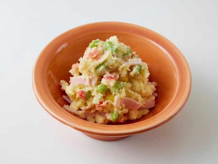 加熱してつぶしたじゃがいもに、ハムやマヨネーズといっしょに混ぜれば、ポテトサラダもあっという間に完成~。