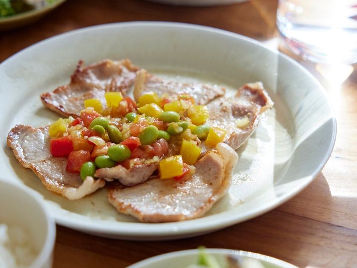 香ばしく焼いた豚肉にかけて、夏らしい一皿に。豚肉で巻いてパクっとどうぞ!