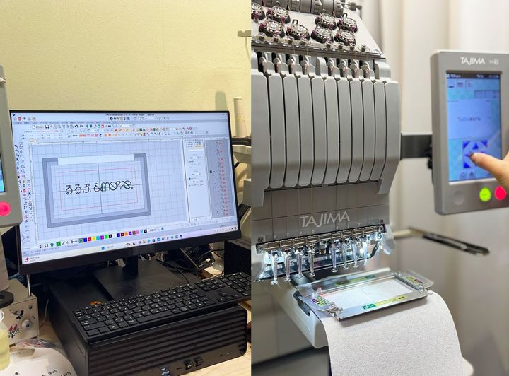 すごいスピードで布に刺しゅうされる様子に思わず感動! その後は刺しゅうされた布にのり付けし、専用の機械でカッティングしてくれます。