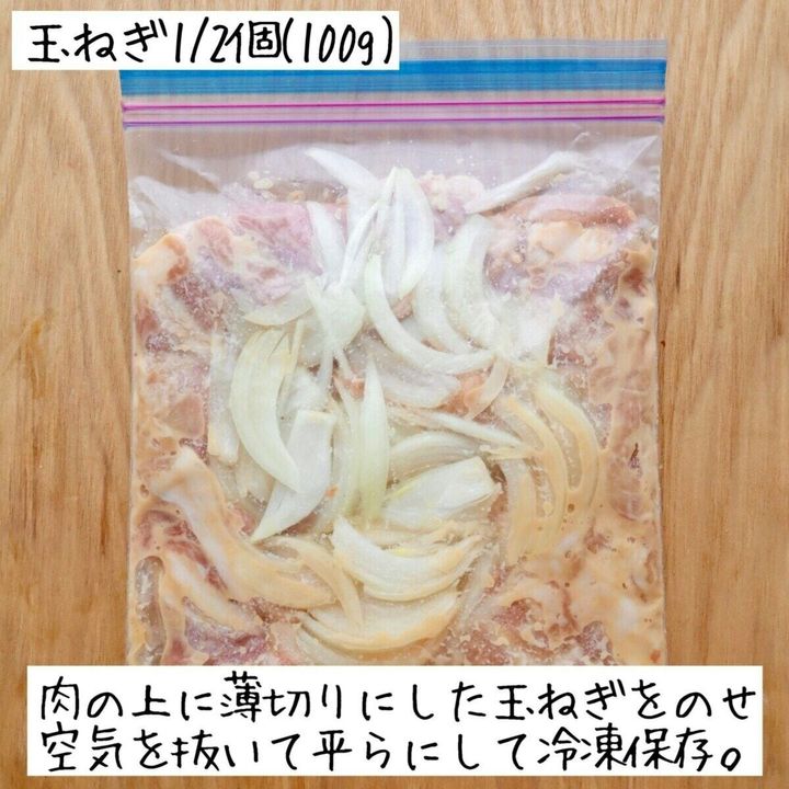 豚肉の上に玉ねぎをのせて空気を抜き平らにし冷凍保存。