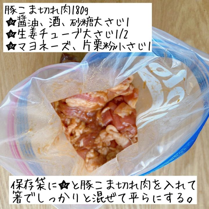 玉ねぎは薄切りにする。保存袋に★と豚こま切れ肉を入れて箸で混ぜ、平らにする。