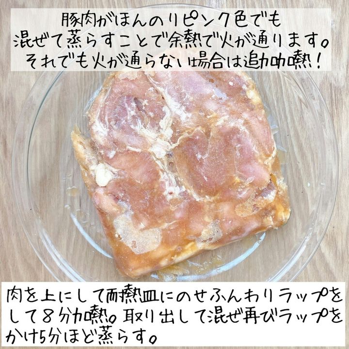 加熱直後は豚肉が少しピンク色でも混ぜて蒸らすことで余熱で火が通るので、加熱のし過ぎには注意してくださいね。驚くほどおいしいので、ご飯をたっぷり準備してお試しください。