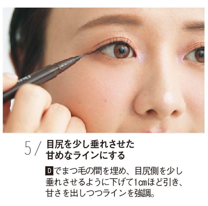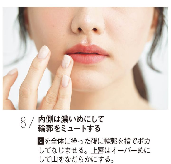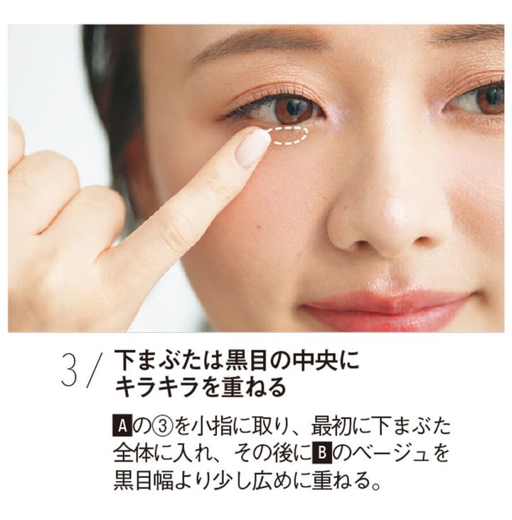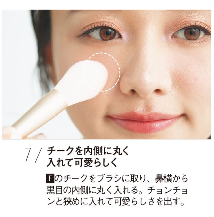 キラキラがぎゅっと詰まったパールカラーを入れ、目元に光でメリハリを出します。チークは内側に入れて可愛らしさを出しつつ、赤みのあるツヤリップは輪郭をボカして曖昧にすることでミュートカラーになじみます。